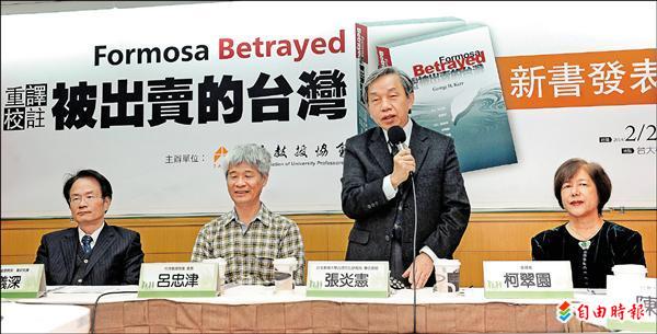 〔記者曾韋禎/台北報導〕曾任美國駐台北副領事的葛超智(George H. Kerr),其描寫二二八事件的名著「被出賣的台灣」,曾是台灣留學生的啟蒙巨作。台灣教授協會用了四年時間,在四十年後予重新譯註,證實其所述皆有根據,並在昨天舉辦「被出賣的台灣」重譯校註版新書發表會。