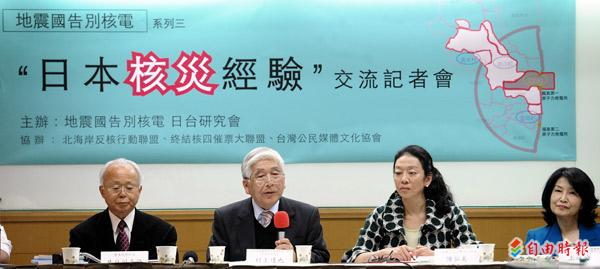 「地震國告別核電─日台研究會」昨舉行記者會,311福島事件所在地雙葉町町長井戶川克隆(左一)、日本全國廢核地方領袖會議會長村上達也(左二)與前東京都市長上原公子(右一),細說核災經驗,右二為研究會發起人陳弘美。(記者張嘉明攝)