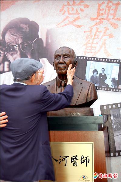 王金河對他的銅像栩栩如生,神態逼真,頻頻摸著銅像臉頰說很像很緣投(台語英俊之意)。(資料照,記者楊金城攝)