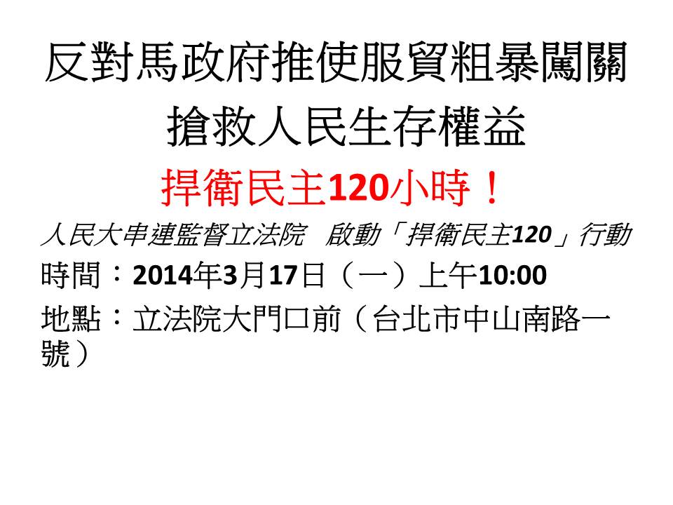 繼上週3月13日,立法院內政委員會召委正式將兩岸服務貿易協議排入聯席會審查後,本週立法院內政委員會又將繼續安排二天半的服貿聯席會審查。各種跡象顯示:在馬總統限期通過的壓力下,林鴻池、張慶忠等立法院國民黨黨團幹部,計畫在本週3/17-3/21聯席會逕自宣布完成服貿協議審查,或逕付二讀,送交院會處理,以「包裹表決」輕率取代實質審查。 在這關鍵時刻,民間社團串連發起「捍衛民主120小時」行動,強力監督立法院,阻擋馬政府毀壞民主體制、推使服貿粗暴闖關,從壟斷利益的少數政商手上奪回人民生存權益。