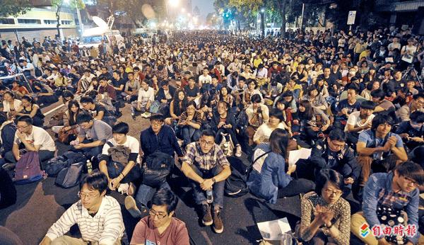 反服貿學生佔領立法院,聲援行動持續增加,入夜後人潮聚集,濟南路上坐滿了民眾。(記者王敏為攝)