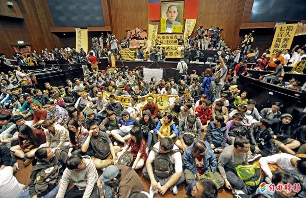 反服貿學生18日晚間衝進立法院並佔據議場,警方昨日發動攻堅,但無法突破障礙,大批學生坐在議場中間集結。(記者劉信德攝)