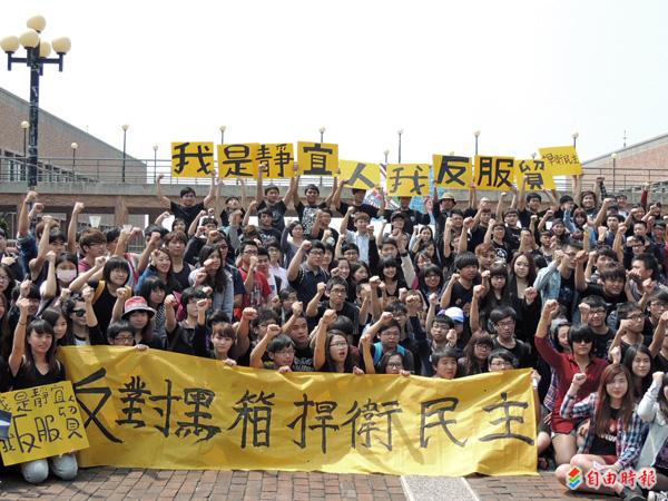 靜宜大學學生昨發起「我是靜宜人! 我反服貿!」聲援立法院抗議活動,吸引數百名學生參與。(記者歐素美攝)