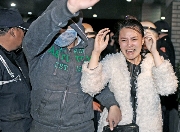 警察昨天凌晨強制驅離行政院周邊學生和民眾時,盾牌拳腳棍棒齊下,有人被打得頭破血流,令人怵目驚心,一名女學生在旁哭喊「為什麼台灣會變成這樣」。(記者溫于德攝)