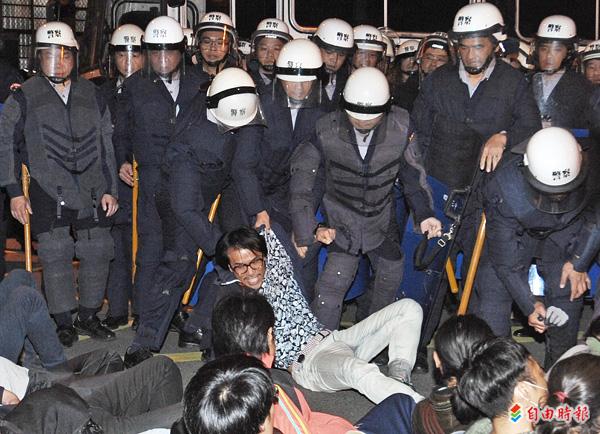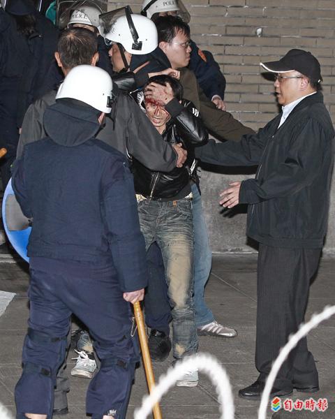 警察昨天凌晨強制驅離行政院周邊學生和民眾時,盾牌拳腳棍棒齊下,有人被打得頭破血流,令人怵目驚心。(記者陳逸寬攝)