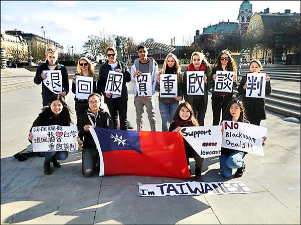 台灣留學生24日在瑞典首都斯德哥爾摩發起反服貿示威,認同該理念的瑞典人也加入抗議行列。(「我是在瑞典的台灣人,我反黑箱服貿」臉書專頁提供)