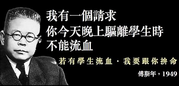 傅斯年不畏強權,1949年到台北接任台大校長,同年4月6日台大和師大發生「四六事件」,軍隊闖入校園逮捕師生,傅斯年親自找國民政府官員交涉,他警告台灣警備總司令部司令彭孟緝:「若有學生流血,我要跟你拚命!」