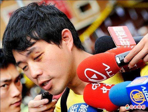東吳大學政研所三年級陳同學左眼傷勢明顯,他說,十幾個警察對付他一人,「警察看我身上沒有傷,還補踹一腳,是不爽嗎?怎麼可以把人民當成敵人?」