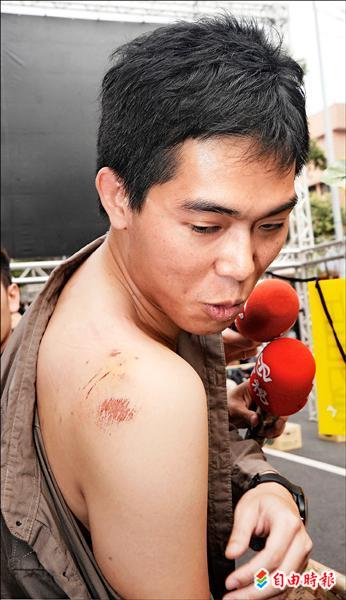 警察粗暴驅離在行政院抗爭的群眾,成大畢業生李先生肩膀受傷。(記者劉信德攝)