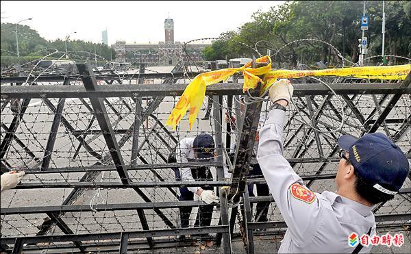 太陽花學運3月30日上凱道,總統府周邊以拒馬層層圍住,並拉上刀片蛇籠。(記者林正堃攝)
