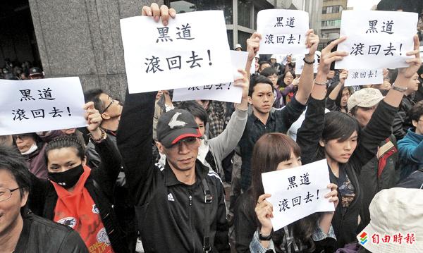 支持學生的民眾高舉黑道滾回去的標語。(記者王敏為攝)
