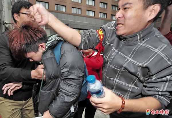 竹聯幫大老「白狼」張安樂與台灣勞工福利聯盟等團體,昨天號召挺服貿民眾前進立法院,白狼群眾明顯挑釁,一位反服貿學生遭支持服貿民眾追打。(記者簡榮豐攝)