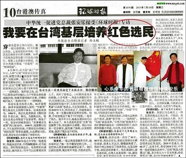 「白狼」張安樂去年接受中共官媒「環球時報」訪問,表明他「要在台灣基層培養紅色選民」,還強調自己不是傾中,是忠中。(取自網路)