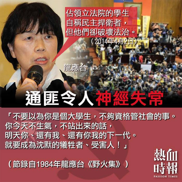 昨日網路上貼出一張諷刺龍應台「昨是今非」的照片及文字,龍應台昨日批評學生佔領立法院是破壞法治;但卻忘了三十年前她的作品《野火集》中呼籲大學生站出來管社會的事。(取自網路)
