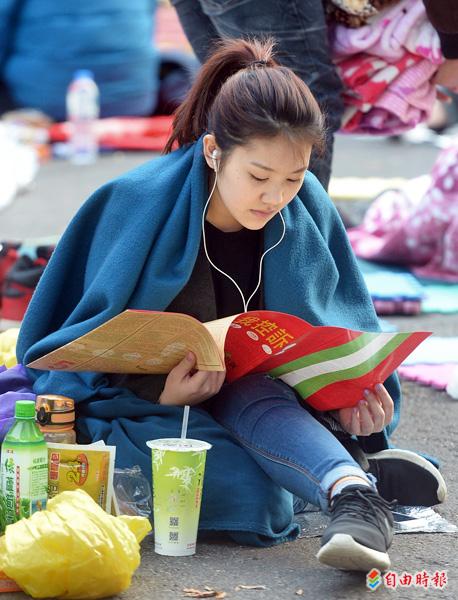 反黑箱服貿學運已經超過半個月,很多學生堅持理念在立法院靜坐未回家,他(她)們很想念爸爸媽媽!昨日八所大學學生會聯名發出「致父母的一封信」,希望父母支持他們的行動;圖為一名學生靜坐在立院外,專心看著一份反黑箱服貿文宣。(記者王藝菘攝)