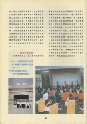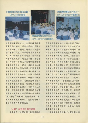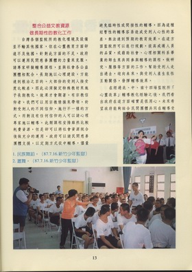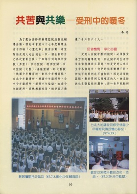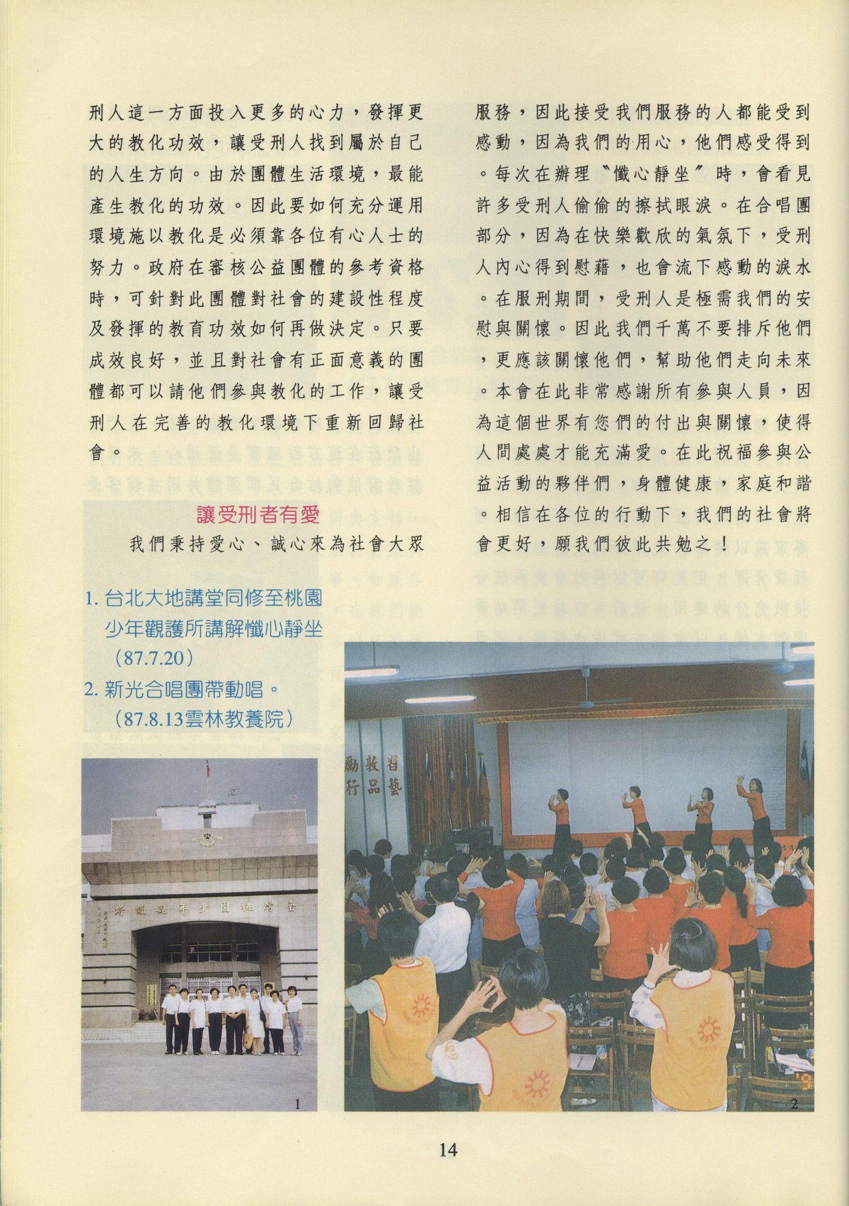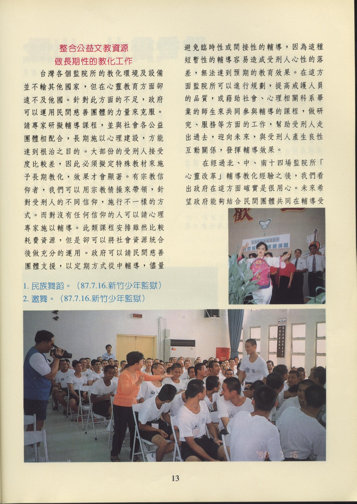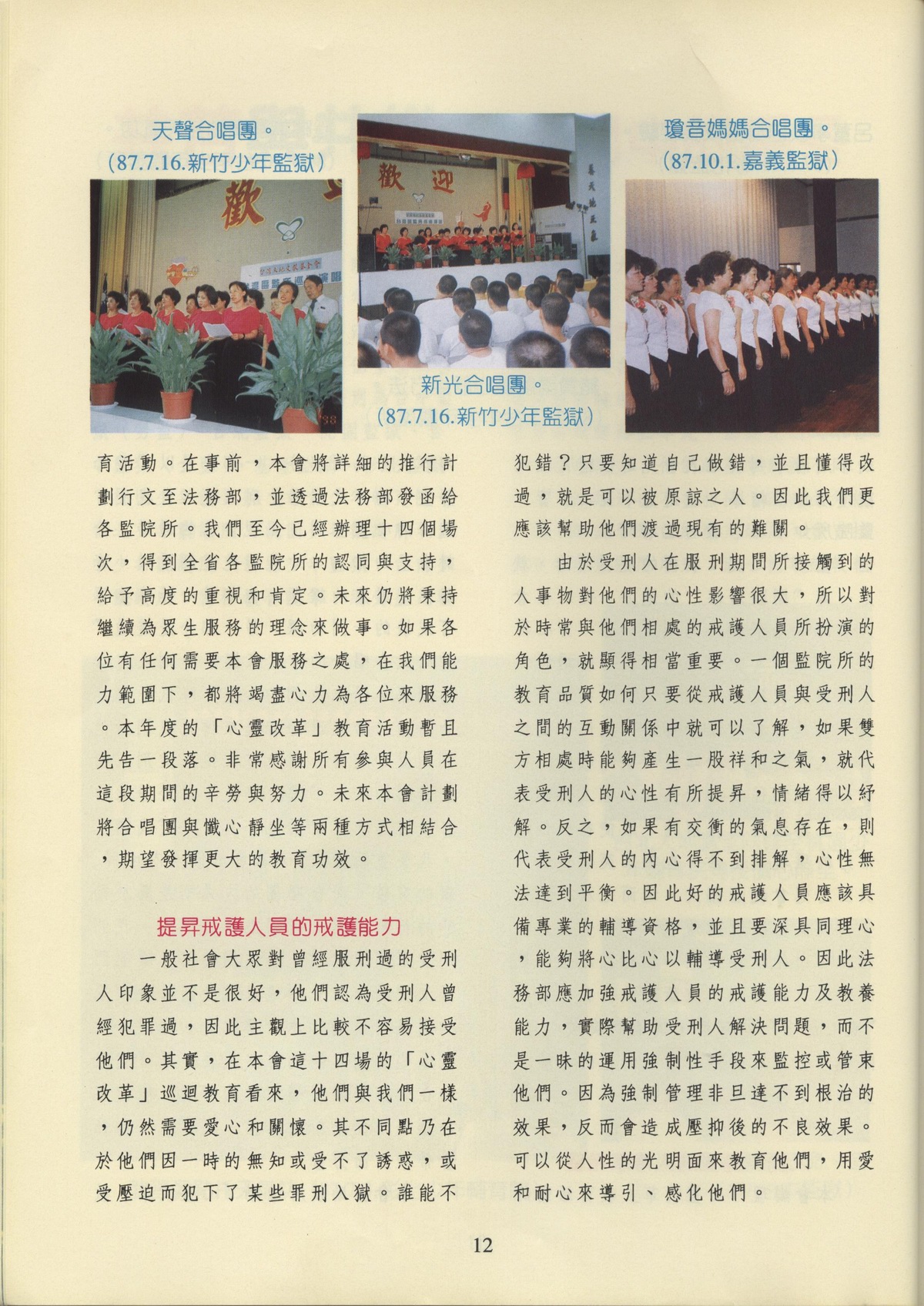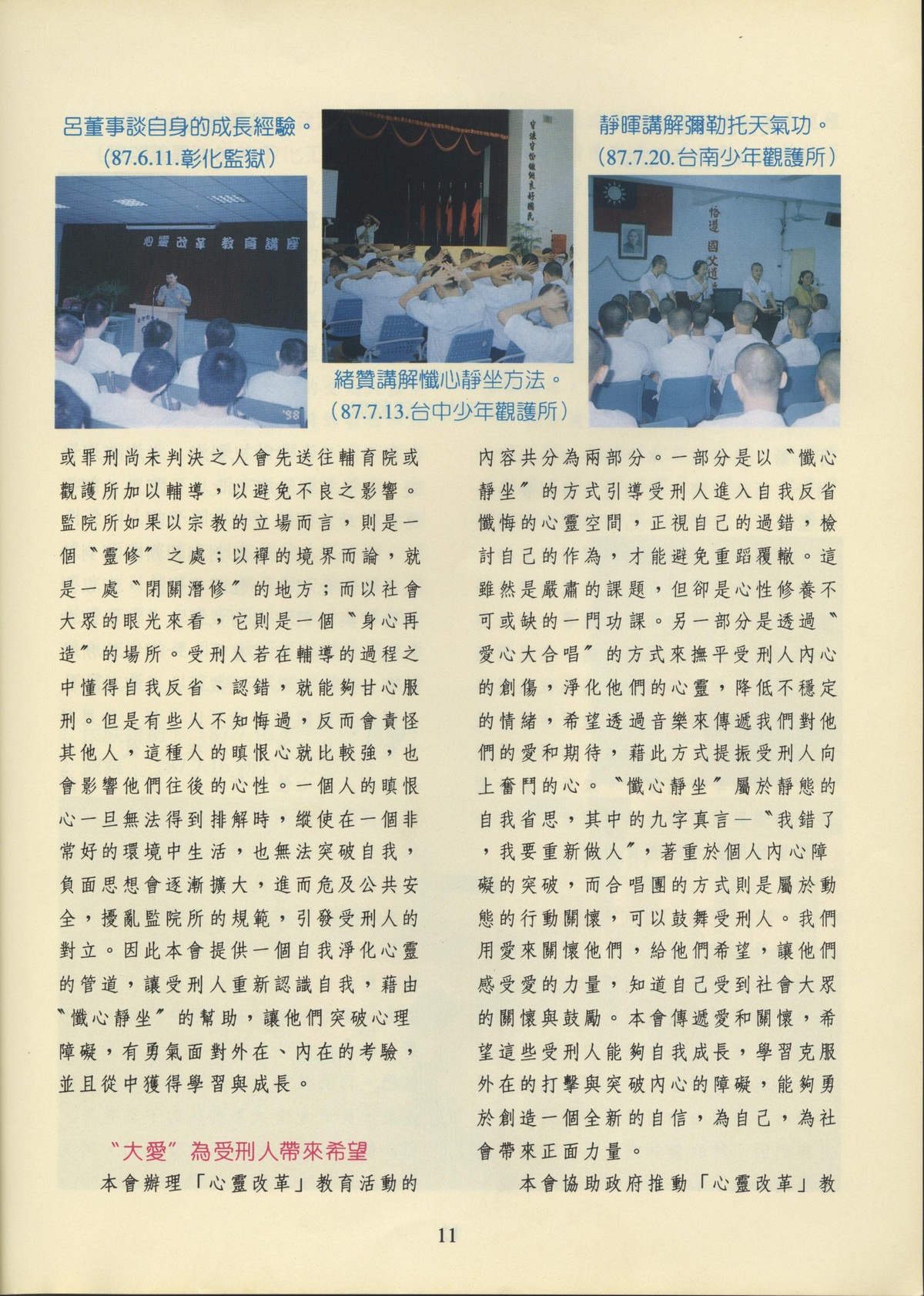 為了配合法務部辦理監院所教化輔導活動,因此本會於八十七年度辦理全省十四場「心靈改革」教育活動,希望幫助受刑人走出過去,以一個全新的自己再次重新出發。十四場分別為台中監獄(男監)、台北監獄、桃園監獄、台中監獄(女監),基隆監獄、彰化監獄、桃園少年輔育院、彰化少年輔育院、台北少年觀護所、桃園少年觀護所、台中少年觀護所、新竹少年監獄、台南少年觀護所、雲林教養院等,總受益人數達二千六百六十人。