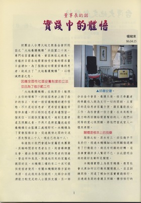 我的一位朋友像多數人一樣,每個月開銷很大,在消遣、玩樂上就佔了總收入的三分之二以上,這情形我得知後,就勸他將這些消遣費用轉移在有利於眾生的事務上。當〝大地養護機構〞成立時,他了解宗旨後,就參與它的運作,每個月參加〝按月奉獻〞的行列,認為這種回饋社會的舉動很好,他願意擴大這方面的興趣,覺得本機構舉辦的活動很符合他的想法,所以他一有空閒時就會來陪這些老人聊天。原本他是一位不曉得人生目標為何的人,現在卻覺得生活中到處充滿樂趣,這對他的生活改變很多,在參予的過程裡他找到了快樂,這是無形應化有形的潛移默化功能,激發了人類蘊藏的菩薩內涵。我希望這種利己又利眾生的活動,大家能一起來參予和經營。本機構期望在二、三年之內購得一塊自有土地(最好不要離市區太遠,以方便家屬探望)。由於土地價格相當嚇人,若有善心人士願意奉獻則是更好,如果有此機會,我們會朝這個方向來做。