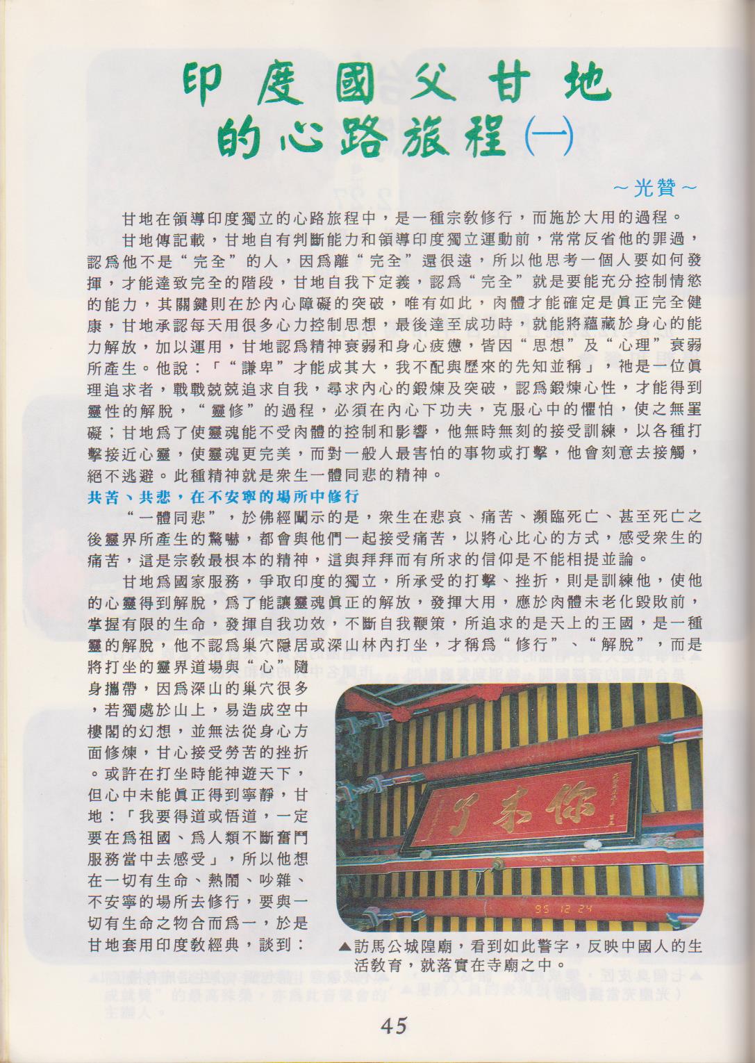 甘地在領導印度獨立的心路旅程中,是一種宗教修行,而施於大用的過程。