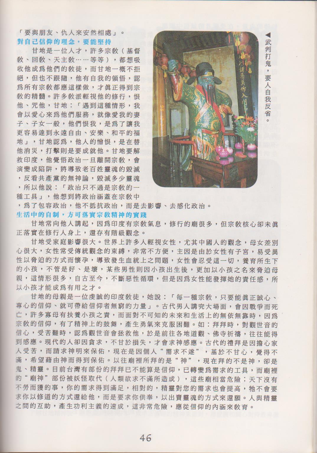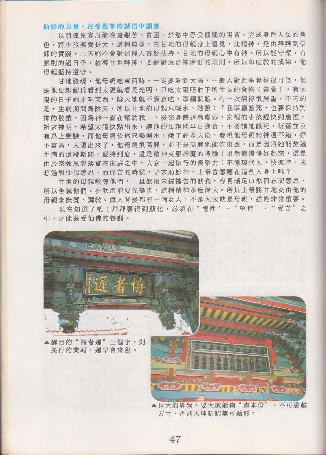 甘地的母親是一位虔誠的印度教徒,她說:「每一種宗教,只要能真正誠心、專心的信仰、就可帶給信仰者無窮的力量」。古代男人講究大場面,會因戰爭而死亡,許多寡母有扶養小孩之責,而面對不可知的未來和生活上的無依無靠時,因為宗教的信仰,有了精神上的鼓舞,產生勇氣來克服困難。如:拜拜時,對觀世音的信心,受苦難時,認為觀世音會拯救他,於是前往各地道觀、佛寺祈禱,往往能得到感應。現代的人卻因貪求,不甘於損失,才會求神感應。古代的禮拜是因擔心家人受苦,而請求神明來保佑,現在是因個人“需求不遂”,基於不甘心,覺得不滿,希望藉由神而得到保佑。以往廟裡所拜的是“神”,現在拜的不是神,卻是鬼、精靈。目前台灣有部份的拜拜已不能算是信仰,已轉變為需求的工具,而廟裡的“廟神”部份被妖怪取代(人類欲求不滿所造成),這些廟相當危險;天下沒有不勞而獲的事,你的需求得到滿足,相對的,精靈對您的需求也會提高,牠不會要求你以修道的方式還給他,而是要求你供奉,以出賣靈魂的方式來還願。人與精靈之間的互助,產生功利主義的速成,這非常危險,應從信仰的內涵來教育。