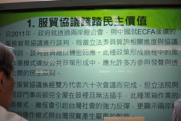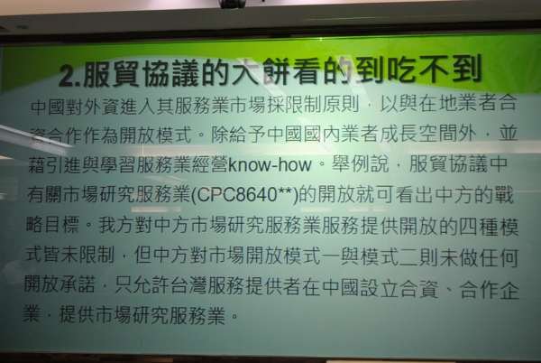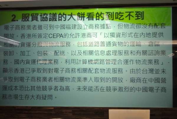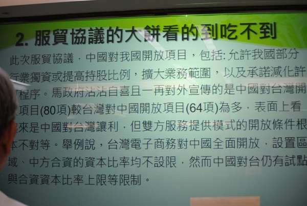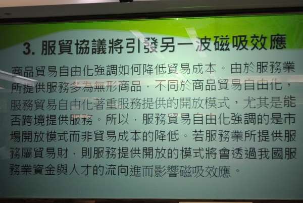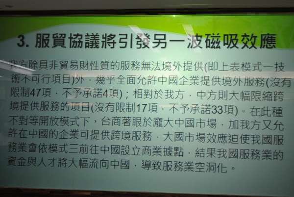 無視經濟體的巨大差異,開放必然產生磁吸效應,加速台灣邊陲化;無視開放低成本且語言、文化、習性相近的中國低技術服務業將產生災難性的替代效果;無視政治體制的不同,中國這塊大餅看得到吃不到。服貿協議以踐踏民主的方式硬是簽下!