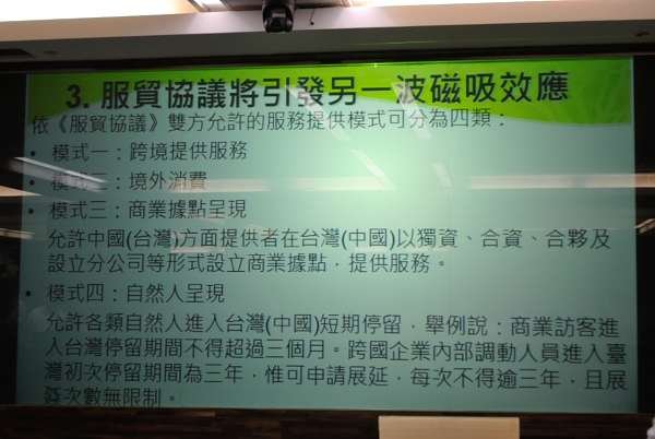 「服務貿易」協議的本質是「服務投資」,以「貿易」之詞掩護「投資」行為;開放中國低技術服務業,進行勞工大舉移民,進行資金、人力的大移動。