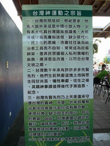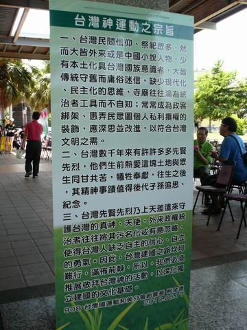 三、台灣先賢先烈乃上天差遣來守護台灣的真神、天使,外來政府統治者往往將其污名化或有意忽略,使得台灣人缺乏自主的信心、自立的勇氣。因此,台灣建國之路坎坷難行,滿佈荊棘,所以,我們必須推展敬拜台灣神的活動,以深化獨立建國的文化基礎。