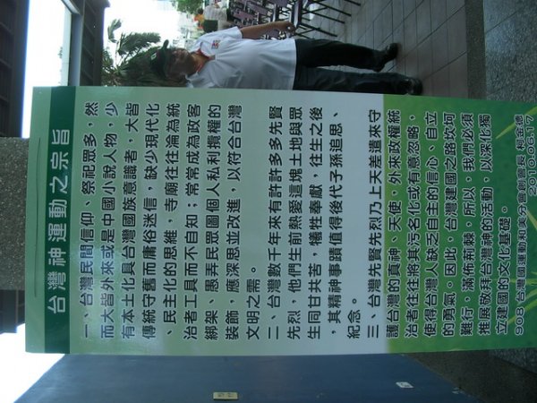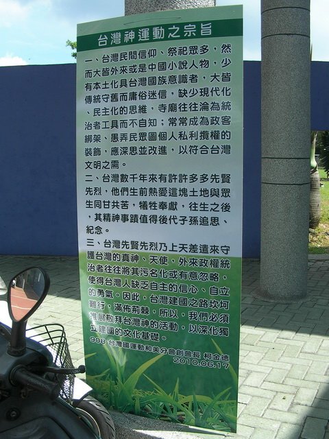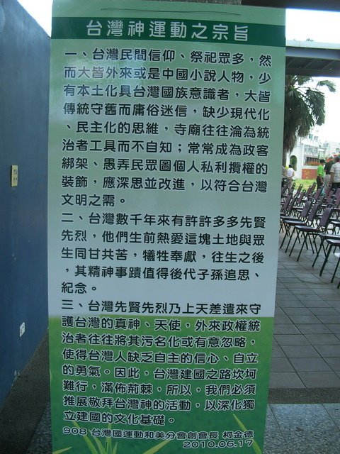 三、台灣先賢先烈乃上天差遣來守護台灣的真神、天使,外來政府統治者往往將其污名化或有意忽略,使得台灣人缺乏自主的信心、自立的勇氣。因此,台灣建國之路坎坷難行,滿佈荊棘,所以,我們必須推展敬拜台灣神的活動,以深化獨立建國的文化基礎。
