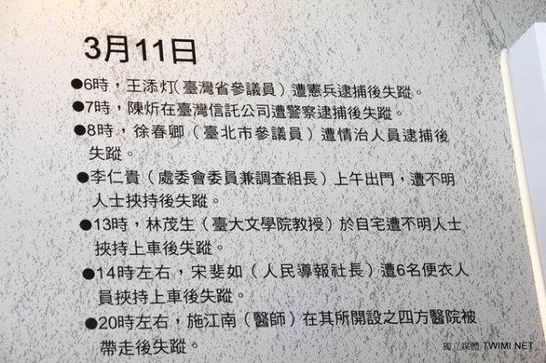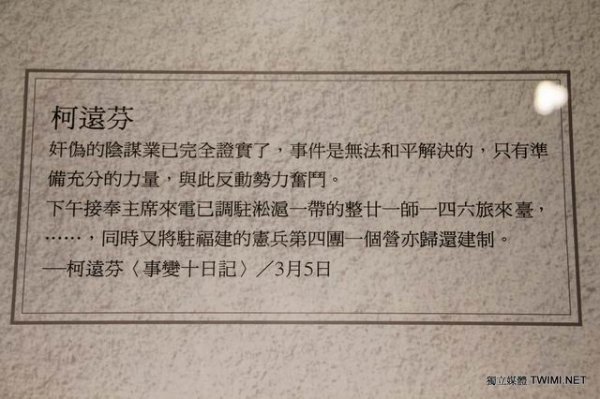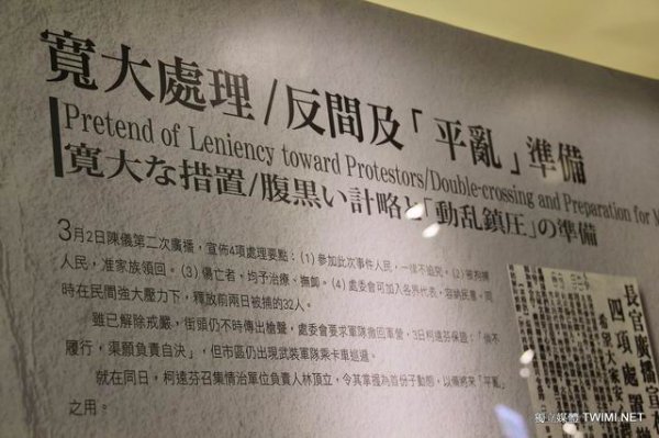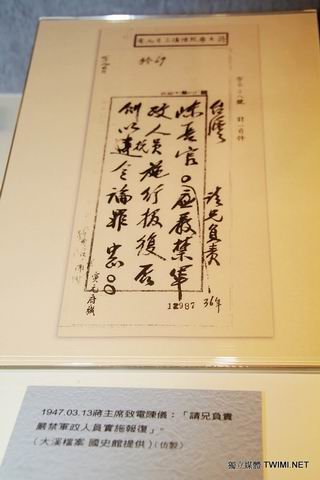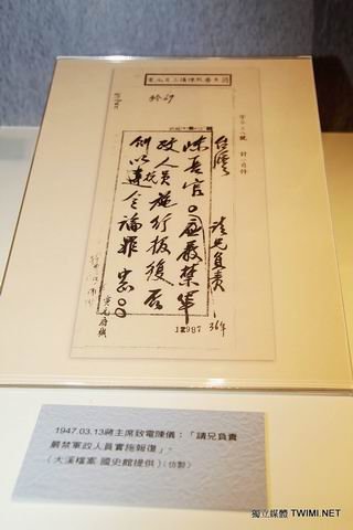 張炎憲教授指出,如展場內有一張蔣介石的手寫稿公文,那是一封正式的公文,內容為『要求陳儀負責嚴禁軍政人員實施報復』,張炎憲表示此公文展出明顯是在為國民黨脫罪,為蔣介石化妝,試圖誤導民眾以為是蔣介石的德政,但事實上蔣介石下令派兵進行屠殺的公文卻未展出,這要讓二二八遺族看到情何以堪!