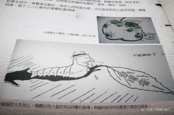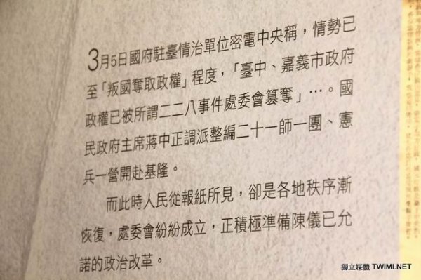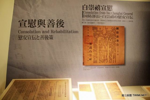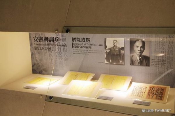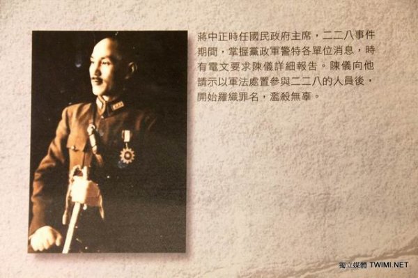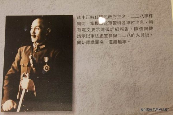 張炎憲教授指出,如展場內有一張蔣介石的手寫稿公文,那是一封正式的公文,內容為『要求陳儀負責嚴禁軍政人員實施報復』,張炎憲表示此公文展出明顯是在為國民黨脫罪,為蔣介石化妝,試圖誤導民眾以為是蔣介石的德政,但事實上蔣介石下令派兵進行屠殺的公文卻未展出,這要讓二二八遺族看到情何以堪!